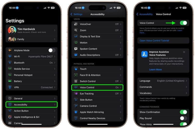 Turn on the switch next to Voice Control so it’s in the green ON position. (You should see a Voice Control active symbol and a little orange dot icon at the top of the screen indicating that Voice Control is using the microphone)