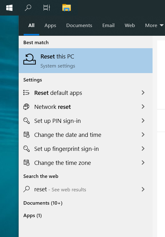 Apăsați butonul de start și introduceți în câmpul de căutare: Reset this PC (ca în imaginea alăturată)