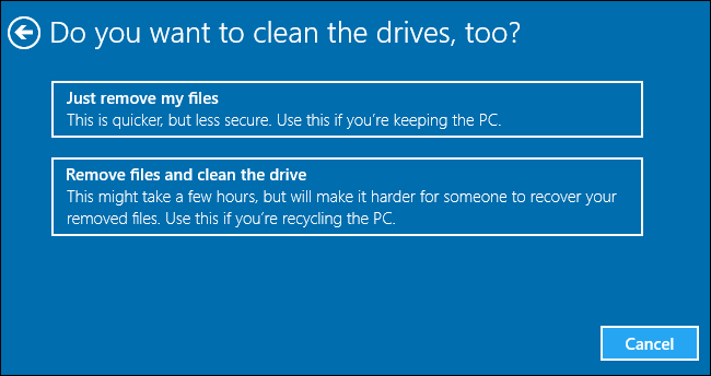 Dacă alegeți să efectuați o instalare de la zero care să șteargă atât fișierele, setările și aplicațiile instalate anterior, puteți alege să ștergeți toate fișierele de pe harddisk prin metoda simplă de ștergere, sau în profunzime, prin curățirea întregului harddisk (proces ce durează, dar care este eficient dacă doriți să ștergeți fișierele fără a mai putea fi recuperate de terți).