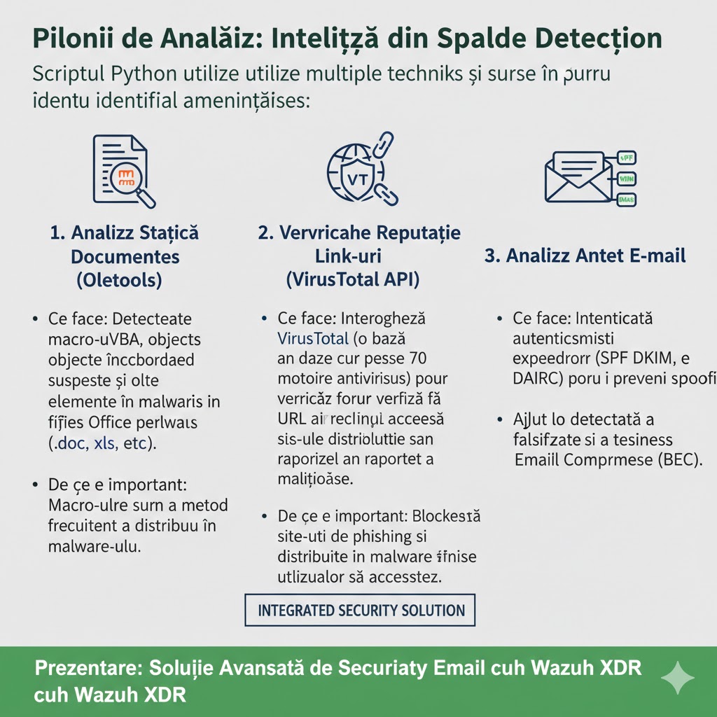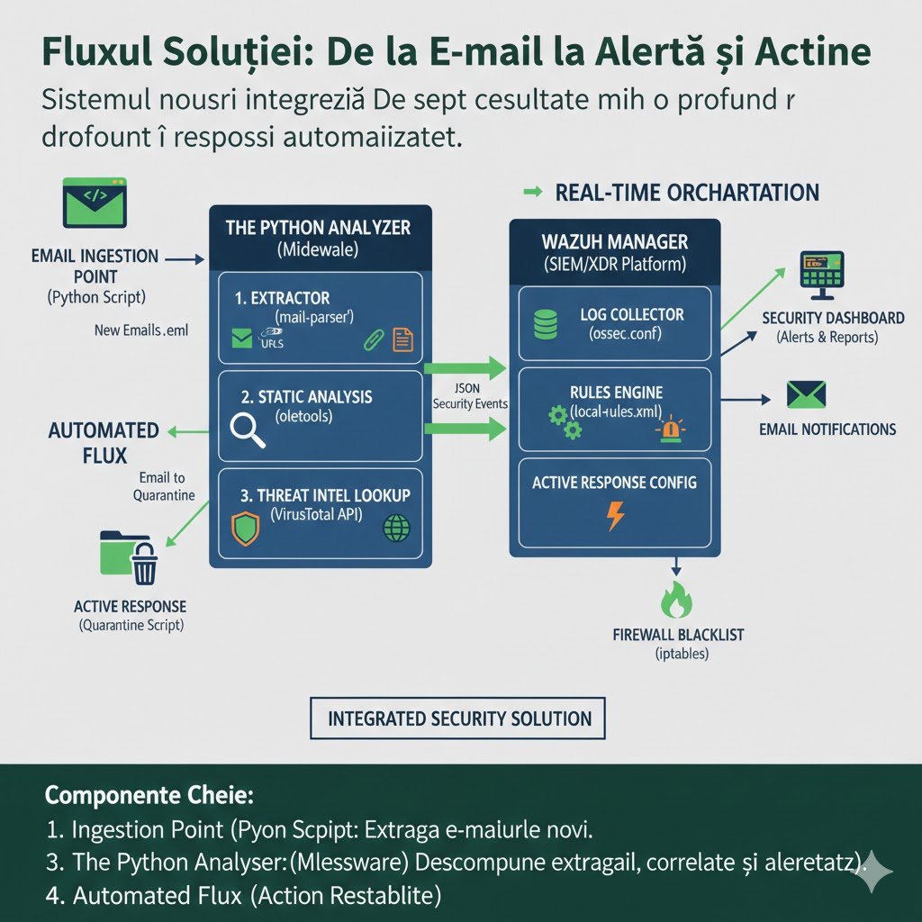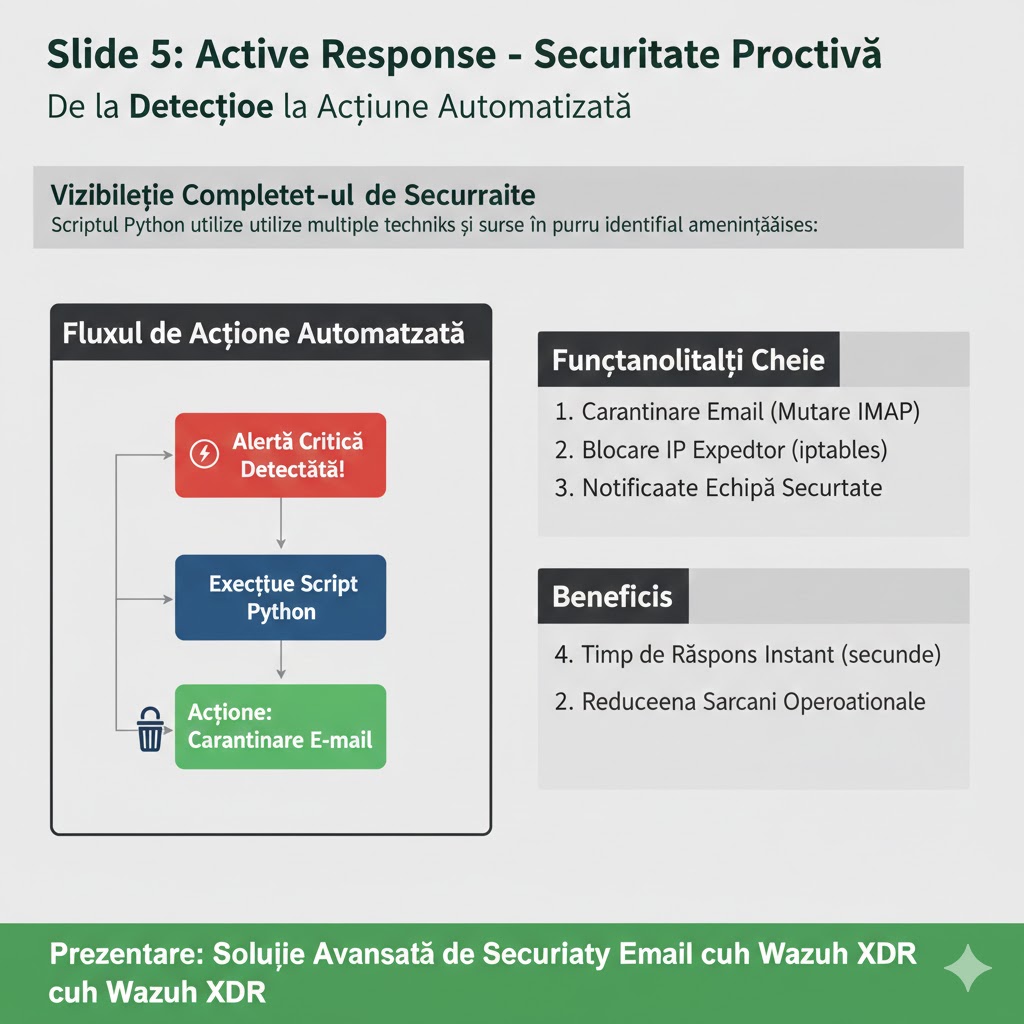 Criticaleste declanșată (ex: atașament cu macro malițios), Wazuh execută un script de răspuns. -