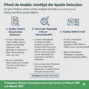 Wazuh Manager colectează rezultatele analizelor Python, le normalizează și generează alerte în timp real, oferind o imagine de ansamblu a amenințărilor.