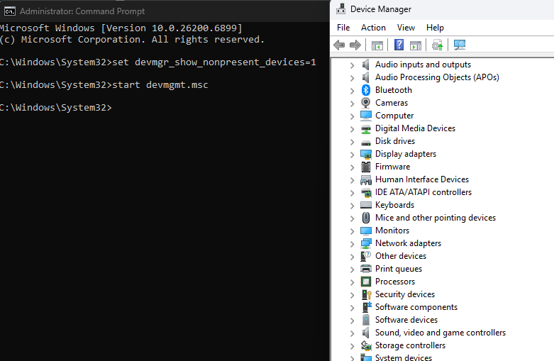 1.Rulam urmatoarea comanda in CMD cu drepturi de administrator pentru adaptoare de retea ascunse.